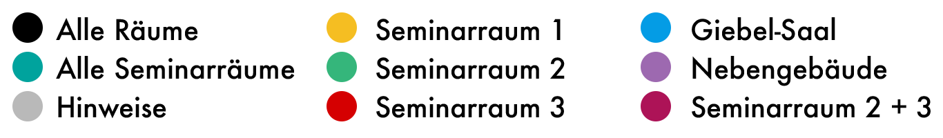 Oben rechts im Kalenderblatt können folgende Ansichten auswählt werden: Terminübersicht (Liste), Wochen- oder Monatsansicht. Hinter dem Kalender-Symbol verbergen sich die verschiedenen Räume im 8Giebel, die jeweils mit einer eigenen Farbe belegt sind. Hier kann ausgewählt werden, welche Räume gleichzeitig angezeigt werden sollen. In der Standardeinstellung werden automatisch alle Räume in der Wochenansicht dargestellt.