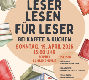 Die Gemeinde Schalksmühle veranstaltet in Kooperation mit der Bücherei Schalksmühle (köB) wieder die beliebte Vorleseaktion „Leser lesen für Leser“. Die Besucher sind eingeladen verschiedensten Geschichten aus unterschiedlichen Sparten zu lauschen. Euch erwartet ein interessanter, literarischer Nachmittag, an dem die Vorleser zeigen, wie schön und wichtig das (Vor-)Lesen ist. Abgerundet wird die Veranstaltung durch die musikalische...