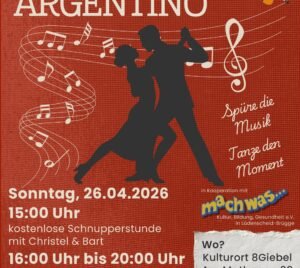 “Entdecke die Faszination des Tangos bei einer kostenlosen Schnupperstunde und genieße anschließend einen stimmungsvollen Tangosalon, offen für alle, die Musik, Tanz und Begegnung lieben.” So heißt es vom 8Giebel friends & more e. V. Tango Argentino Tango Argentino – das ist Leidenschaft, Musik und Kommunikation ohne Worte. Gemeinsam mit dem mach was… Kultur, Bildung, Gesundheit...